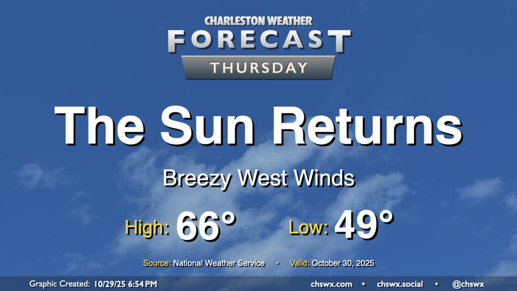 A cold front will swing through overnight, scouring out the clouds and ushering in drier high pressure behind it. It’ll be great to see the sun, which will make highs in the mid-60s feel quite nice. We’ll have a bit of a westerly breeze in the wake of the front, so keep that in mind if you have any plans to dine al fresco, but otherwise, it looks like a really good day of weather across the Lowcountry.
