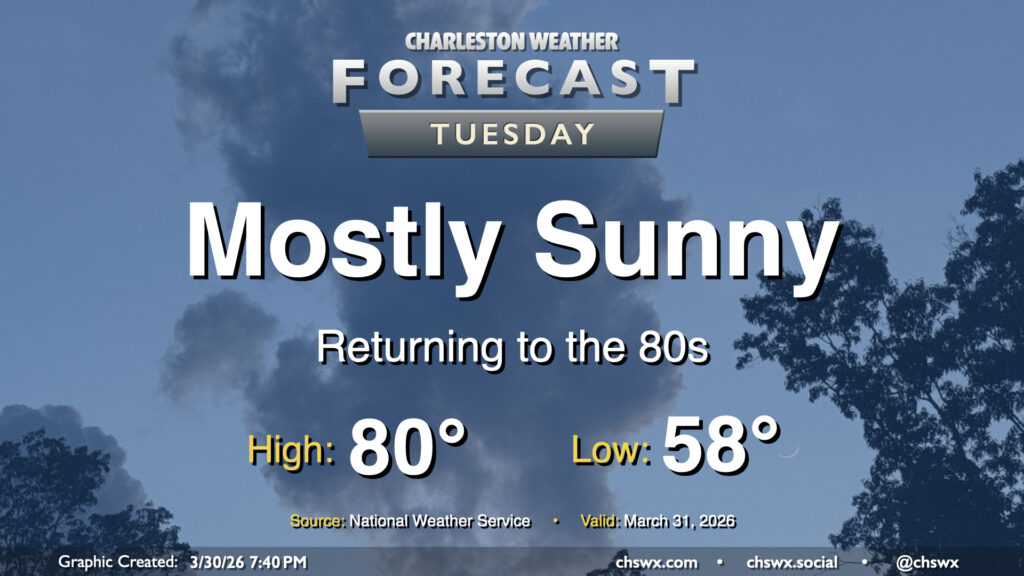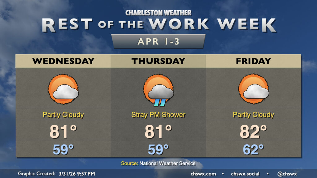 After a couple cooler days, the 80s return to the Lowcountry starting Tuesday and lasting well into the beginning of April. High pressure remains the main weather feature, keeping us generally on the quiet side. A southerly breeze around 5-10 MPH will be common, especially as we get into the afternoon. Thankfully, some higher dewpoints will also continue to put a dent in the fire danger.