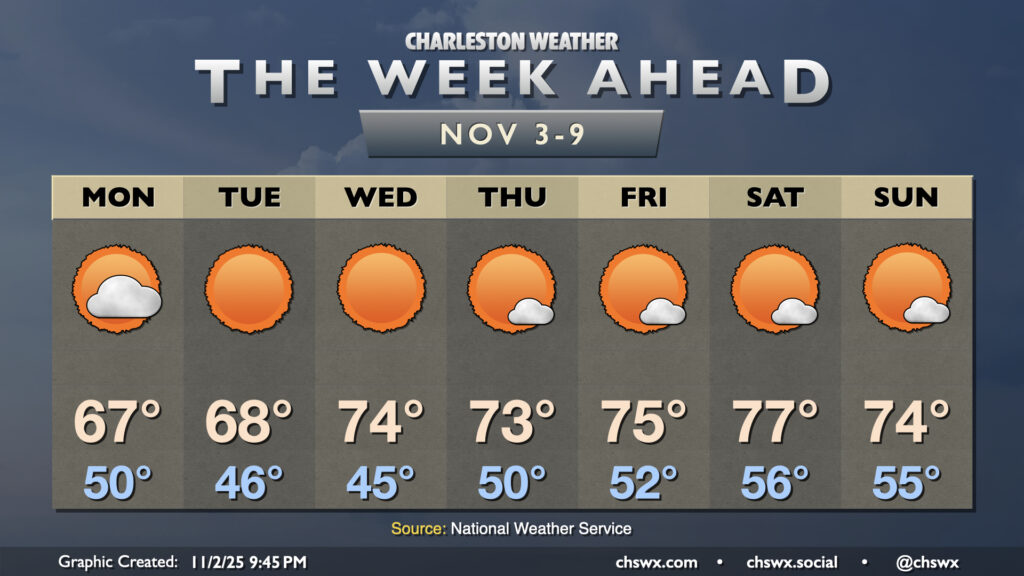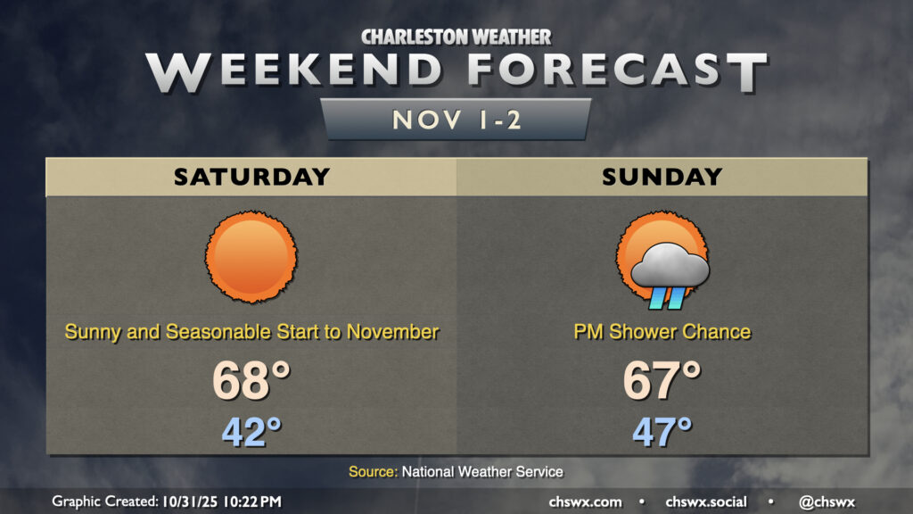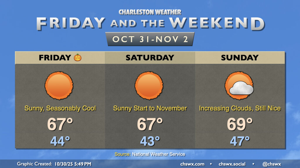 A cold front will swing through overnight, scouring out the clouds and ushering in drier high pressure behind it. It’ll be great to see the sun, which will make highs in the mid-60s feel quite nice. We’ll have a bit of a westerly breeze in the wake of the front, so keep that in mind if you have any plans to dine al fresco, but otherwise, it looks like a really good day of weather across the Lowcountry.