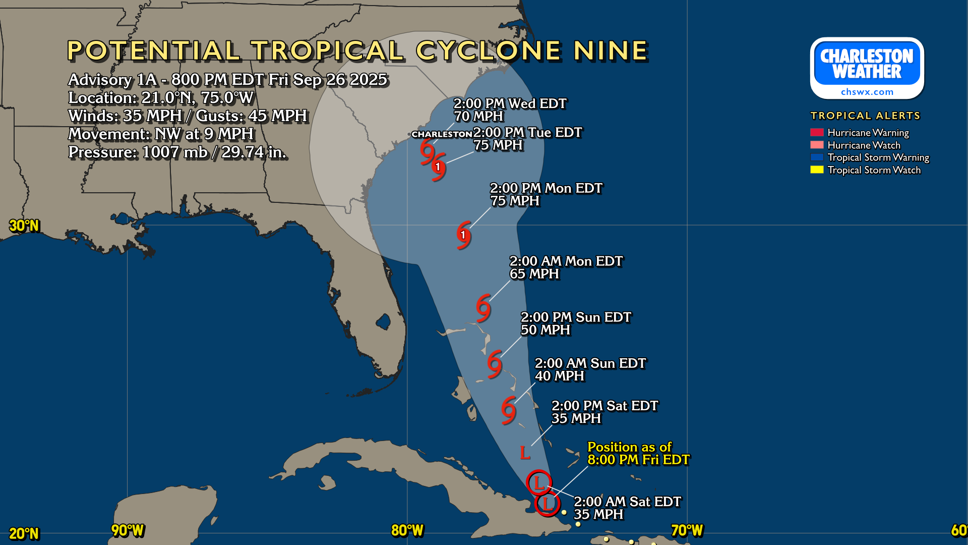 Potential Tropical Cyclone Nine continues to try to organize just north of Cuba this evening. Land interaction and shear will continue to work on the thunderstorm complex in the short term before relaxing on Saturday. This will allow the circulation to gather itself and finally form into a tropical depression by Saturday afternoon, according to the NHC forecast. From there, Nine continues to move northwestward through the Bahamas, slowly gaining strength and likely getting the name Imelda in the process (though that’s not always a given). By Monday afternoon, it will likely have strengthened into a hurricane as it continues on its northwestward trek. By Tuesday afternoon, though, the NHC forecast has the storm essentially stalling out just off our shores, keeping it in place through at least Wednesday. If this forecast verifies — definitely not a given at this point considering significant uncertainty that remains in the model guidance — we could see a prolonged period of heavy rain and wind across a good bit of the area. Storm surge will factor in along and north of the center along with the risk for tropical tornadoes. Again, though, so much of this initial thinking relies on details that are as yet unknowable, and we need more data to gain confidence in the forecast. A more northerly track mutes these impacts considerably for our neck of the woods, and vice versa. There’s even still the possibility that Humberto helps pull Nine/Imelda out to sea, minimizing our impacts locally. Unfortunately, it’s just wait and see at this stage.
