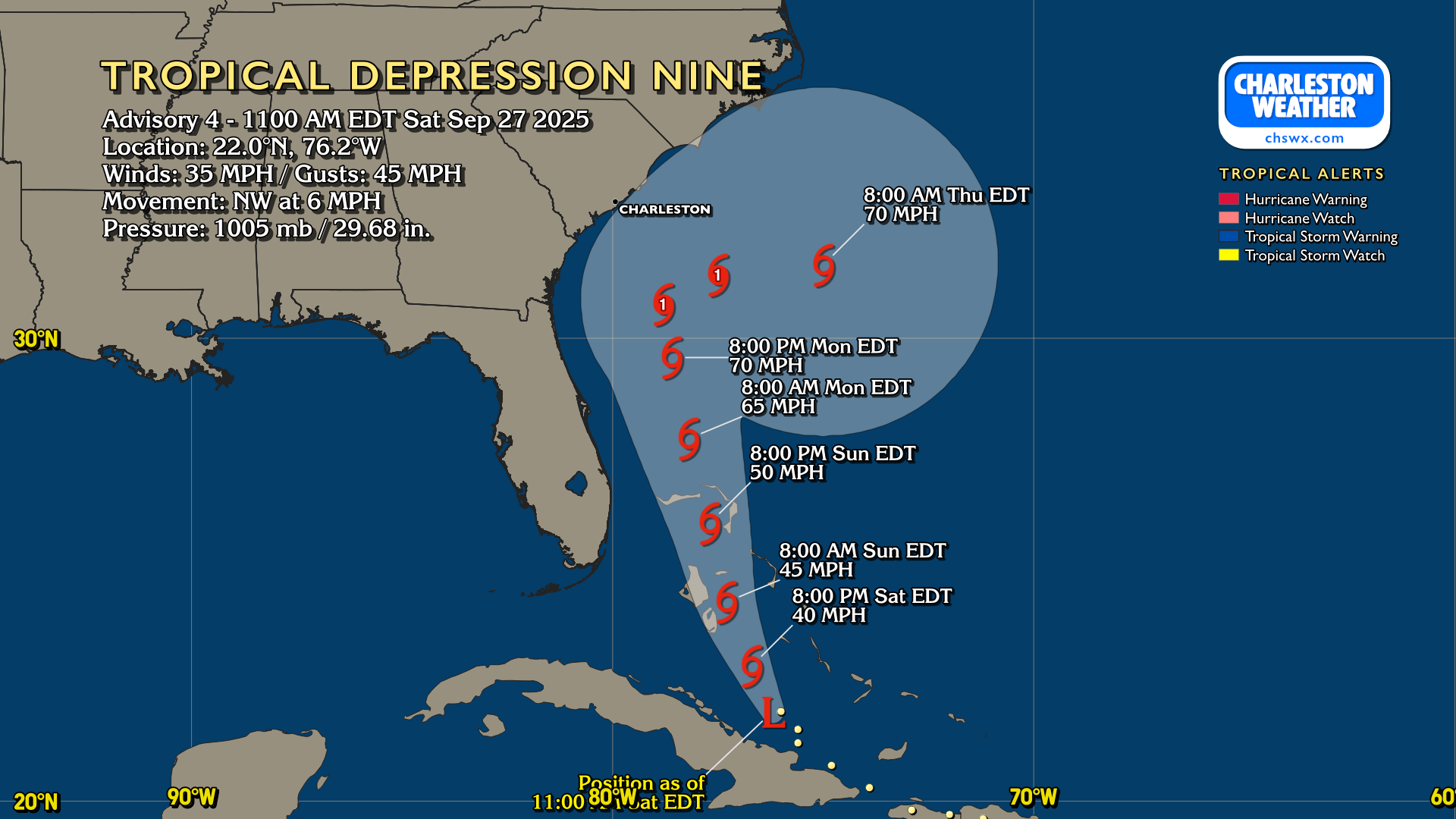 Nine is now officially a Tropical Depression after Hurricane Hunters found a low-level center. It is forecast to become a tropical storm tonight; the next name is Imelda. While risk for direct landfall is decreasing, rain and coastal impacts remain in play.