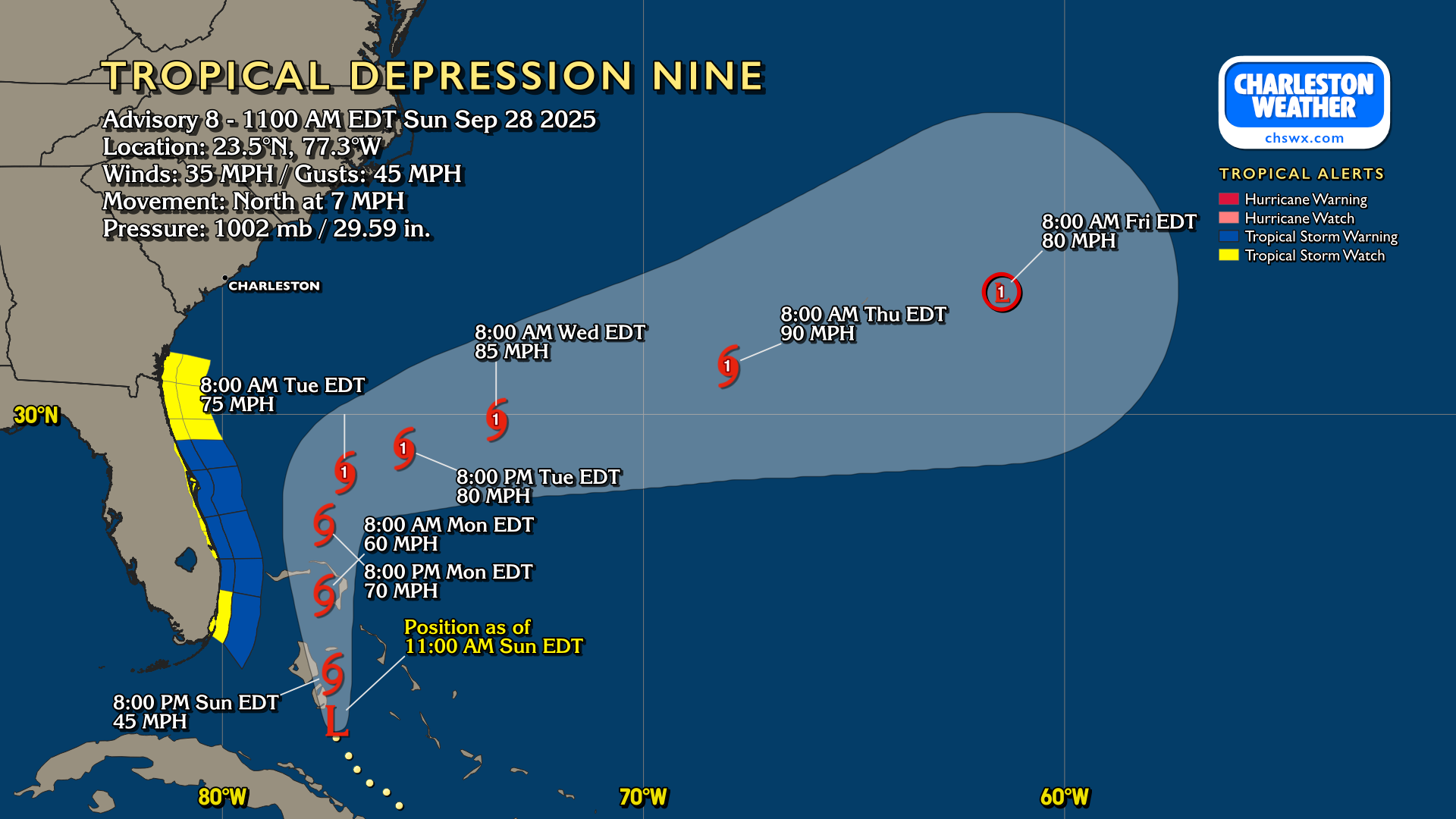 Confidence continues to increase in the sharp right turn out to sea for future Imelda by midweek, which is excellent news for our neck of the woods. Still, the feed of moisture around the storm will interact with a stalled front near the coast to bring some heavy rain at times.