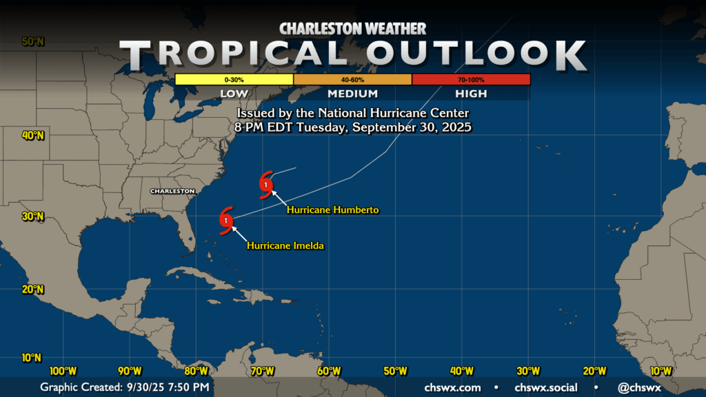 Imelda and Humberto, both Category 1 hurricanes, are heading eastward, unfortunately affecting Bermuda in the process. The storms continue to behave as forecasted, and there are no going tropical concerns here in the Lowcountry. We’ve got two months left in hurricane season, so it behooves us to maintain watch, but we’ll be through it before you know it.