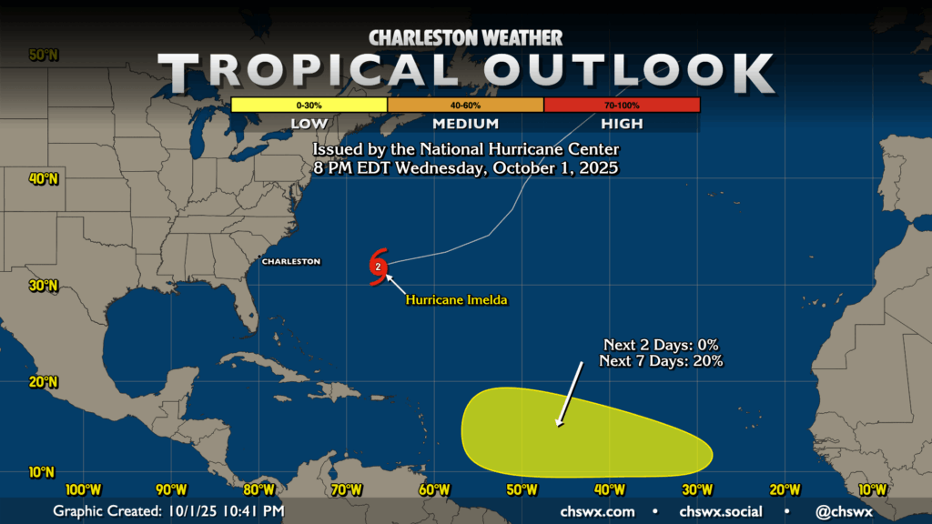 Imelda continues to move out to sea, but not before bringing hurricane conditions to Bermuda including strong winds, heavy rain, and rough surf. It’s packing 100 MPH winds and is moving quickly ENE at 24 MPH. It’s starting some interaction with a front that will aid it in transitioning to an extratropical cyclone over the next few days.