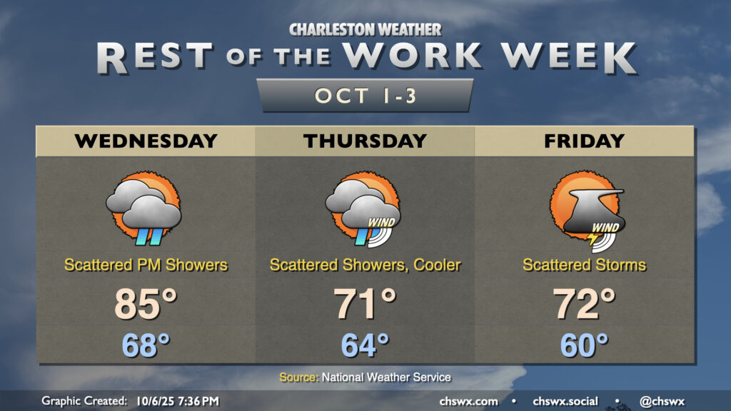 We’ll have one more day in the 80s on Wednesday before a front moves through from the north, ushering in a wedge of cool high pressure that’ll drive high temperatures down to the low 70s for Thursday and Friday afternoons for the first time since May 10 when the high temperature was 71°. The front will usher in the risk for showers beginning later Wednesday, and this will persist into the early weekend. It won’t be an all-day rain, though. Winds may be a bit more impactful, as gusts 25-30 MPH will be possible at the coast as high pressure wedges into the area and low pressure potentially spins up offshore. This surge of northeasterly wind should also drive water levels up, particularly around the morning high tides. Moderate flooding is expected Wednesday morning, with major flooding expected Thursday morning. Another round of moderate to major flooding seems probable Friday around midday, too. Stay tuned for Coastal Flood Advisories and Warnings from the National Weather Service, especially as we head into late week.