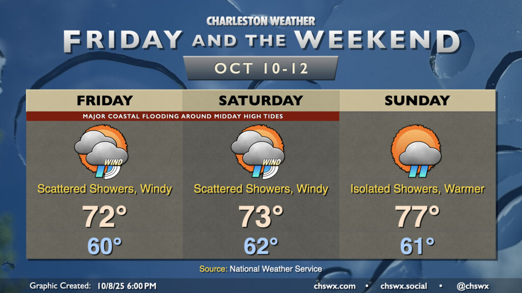 Windy and cooler-than-normal conditions will continue heading into Friday and the weekend as an early-season nor’easter develops offshore, pinching the pressure gradient between high pressure anchored to the northeast. Shower chances will persist Friday into Saturday, and will largely be governed by how close low pressure ultimately gets to the coast. The current forecast indicates some spots near the coast could get an inch-plus of rain before it’s all said and done, but we’ll see how the details ultimately work out. Regardless, gusts 30-35 MPH will be common, and this will continue to drive large tidal departures on top of already significant king tides, particularly during the midday high tides Friday and Saturday. Friday’s water level forecast is particularly concerning, with a top-15 record tide possible. NWS is forecasting between 8.4-8.6′ MLLW with the high tide that should peak a little after 11 AM. This is very comfortably in major coastal flooding territory, and we can expect numerous roads in downtown Charleston to close, with some coastal flooding impingement on James and Johns, Daniel Island, and along Long Point Rd. in Mt. Pleasant. Flooding should begin by 9 AM, with the worst between 10 AM and 1 PM.