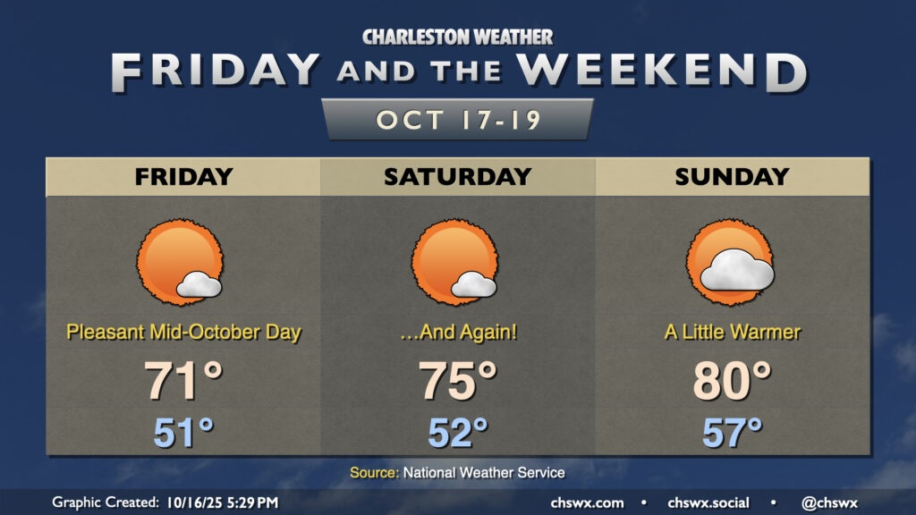 High pressure remains the main weather player in our neck of the woods, keeping things generally quiet and seasonable for Friday and the weekend. You may need a light hoodie or somesuch Friday morning as lows bottom out to the low 50s in the metro and perhaps into the 40s further inland and in more rural locations. Highs Friday peak in the low 70s with plenty of sunshine expected.