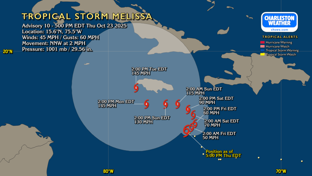 Hurricane season continues with Tropical Storm Melissa in the Caribbean. Melissa is drifting NNW at 2 MPH, and should meander while strengthening heading into the weekend. It’s expected to become a hurricane on Saturday, and may become a formidable, slow-moving Category 4 storm by Sunday. This could be a particular issue for Jamaica, Cuba, and Hispaniola in particular as the slow-moving storm just hangs around for several days, perhaps not catching its ride out of there until Wednesday or Thursday. As for where it ultimately goes, the ensembles are strongly favoring a track that spreads at least some impacts to the Bahamas before heading out to sea, perhaps kicking some waves our direction but little else. Hurricane season continues until November 30.