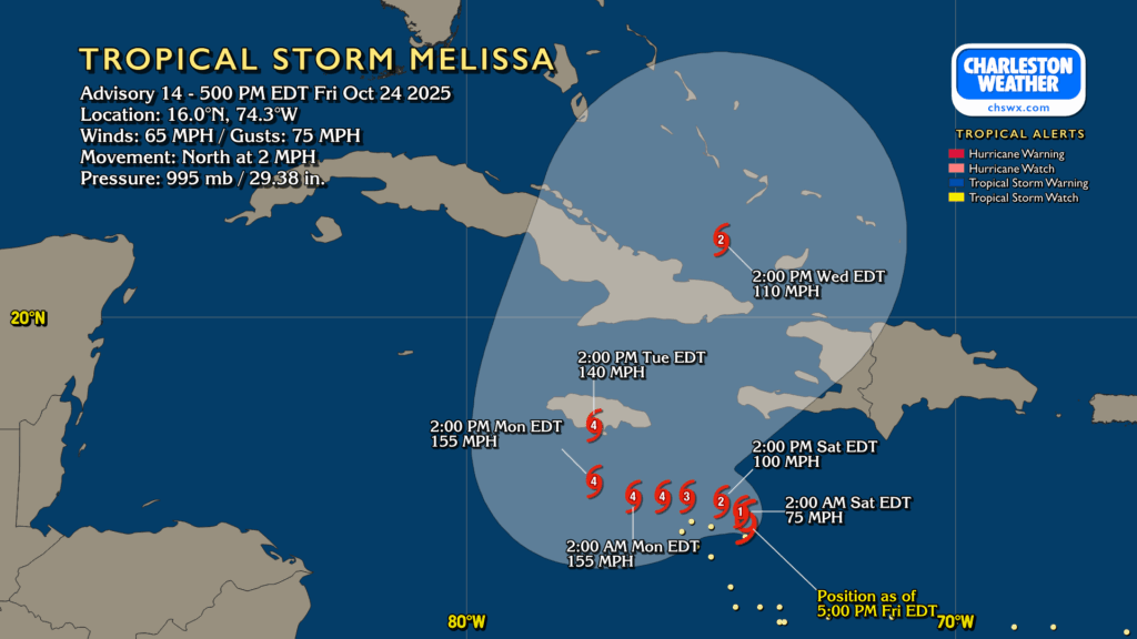 Finally, slow-moving Tropical Storm Melissa continues to get better organized and should become a hurricane by tomorrow. The NHC forecast is certainly concerning for Jamaica in particular, with hurricane conditions possible in Cuba and Haiti as well as Melissa is forecast to intensify to a very strong Category 4 storm. Category 5 intensity is not explicitly forecast, but it is well within the realm of possibility. The bigger story, though, will be very heavy rainfall over the course of several days as the hurricane moves very slowly in the Caribbean before making landfall on Jamaica on Tuesday. From there, it will finally catch a ride to the north and northeast, but not before threatening the Bahamas with hurricane conditions for the middle of next week. Direct impacts from Melissa aren’t expected, but don’t be surprised if the sea is a little angrier next weekend.