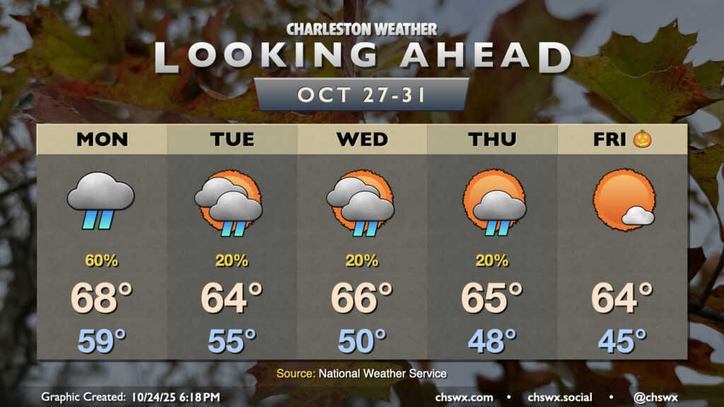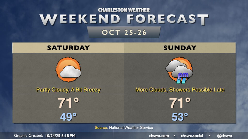 Saturday’s lows will once again begin in the upper 40s (with some mid-40s inland), warming to the low 70s in the afternoon under partly cloudy skies. Cloud cover will continue to thicken on Sunday as moisture return continues; this will lead to a warmer start in the mid-50s before highs peak around 70-71° once again under mostly cloudy skies. Showers and maybe even some rumbles of thunder will be possible beginning Sunday evening, so keep that in mind as you make your weekend plans.