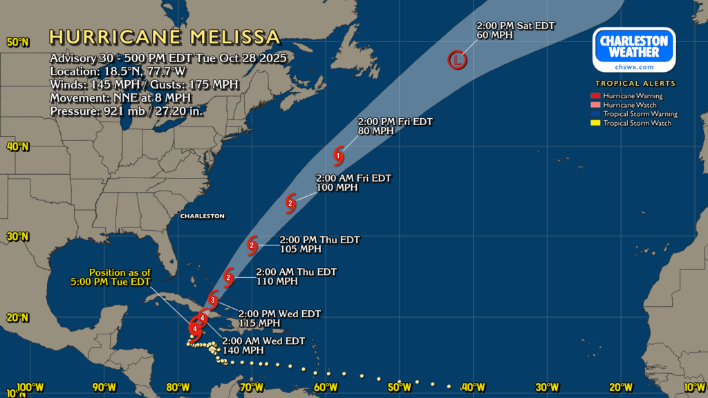 As of the 5PM advisory, Melissa had 145 MPH maximum sustained winds with gusts to 175 MPH. It was moving NNE at 8 MPH, and pressure was up to 921mb after land interaction weakened the storm. At this writing, though, Melissa is back over water and seems to be regaining organization quickly as it sets its sights on eastern Cuba for a second landfall overnight. From there, Melissa will have impacts on the Bahamas as it accelerates northeastward, giving Bermuda a brush later this week before finally making an extratropical transition by Saturday. There are no concerns locally for Melissa, though some wave action may not be off the table as the storm moves by.