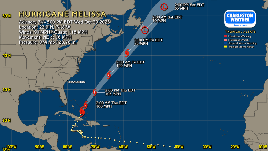Hurricane Melissa made landfall on Cuba last night as anticipated, and the tough terrain disrupted the circulation enough to knock it down to a strong Category 1 storm as of the 5PM advisory. However, it’s back over water, getting some organization back, and will be affecting the Bahamas as a Category 2 storm through Thursday. It’ll be gaining forward speed as it moves northeastward toward Bermuda, which will probably take a glancing blow from what is expected to still be a Category 2 hurricane, though it’ll be short-lived as Melissa continues to accelerate northeastward toward extratropical transition over the weekend.