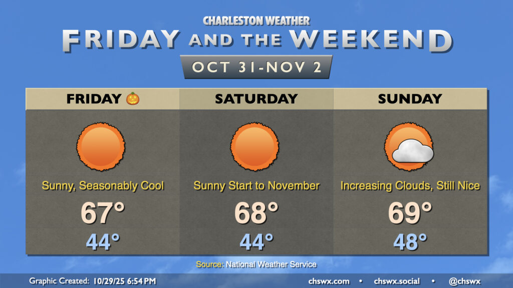 A cold front will swing through overnight, scouring out the clouds and ushering in drier high pressure behind it. It’ll be great to see the sun, which will make highs in the mid-60s feel quite nice. We’ll have a bit of a westerly breeze in the wake of the front, so keep that in mind if you have any plans to dine al fresco, but otherwise, it looks like a really good day of weather across the Lowcountry.