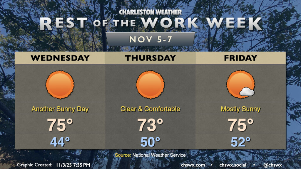 As mentioned, some coastal flooding will be possible between 5-8am as water levels peak in minor flood stage (7-7.2′) with the 6:11 am high tide. This may have limited impacts in the most vulnerable areas of the peninsula, primarily around the Hagood/Fishburne intersection as well as possibly on parts of Lockwood. Be ready to reroute around any closures.