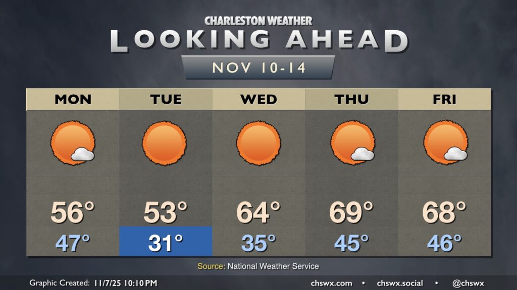 Big changes are in store starting Monday in the wake of the aforementioned cold front. Temperatures will fall well below normal for January, much less November, as chilly high pressure builds in. Lows on Monday bottom out in the mid-40s, but highs will struggle into the mid-50s as cold air blows in. We’re likely to see the first freeze of the season Monday night into Tuesday morning as lows fall into the upper 20s inland to low 30s in the metro area, with winds making it feel even colder. Temperatures will only peak in the low to mid-50s once again despite full sunshine.
