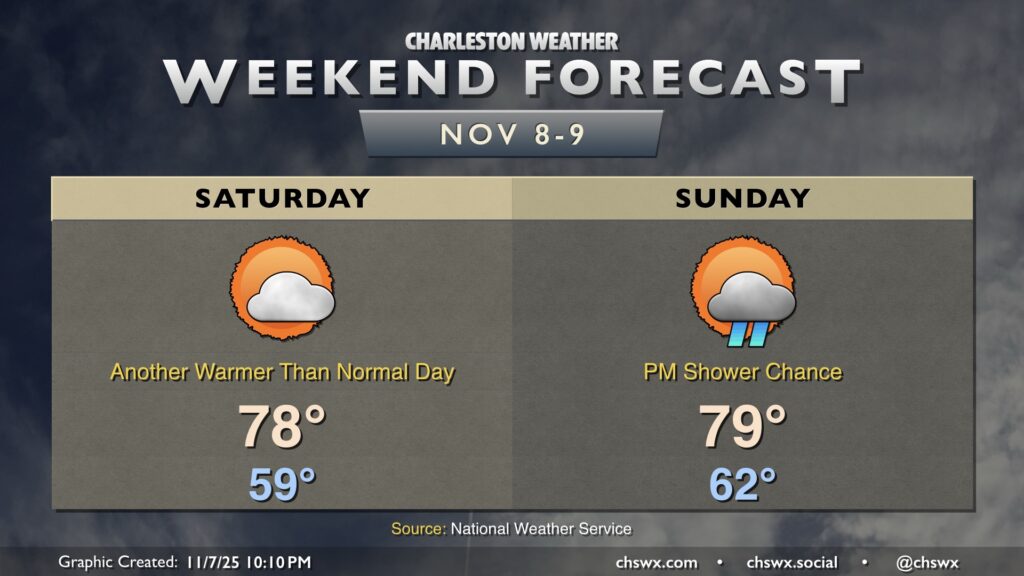 A couple more warm days lie ahead before the coldest airmass of the season crashes into the area next week. Saturday will generally feature temperatures in the upper 70s after starting the day near 60°. We’ll keep a few clouds around, but the risk for any rainfall should be very low.