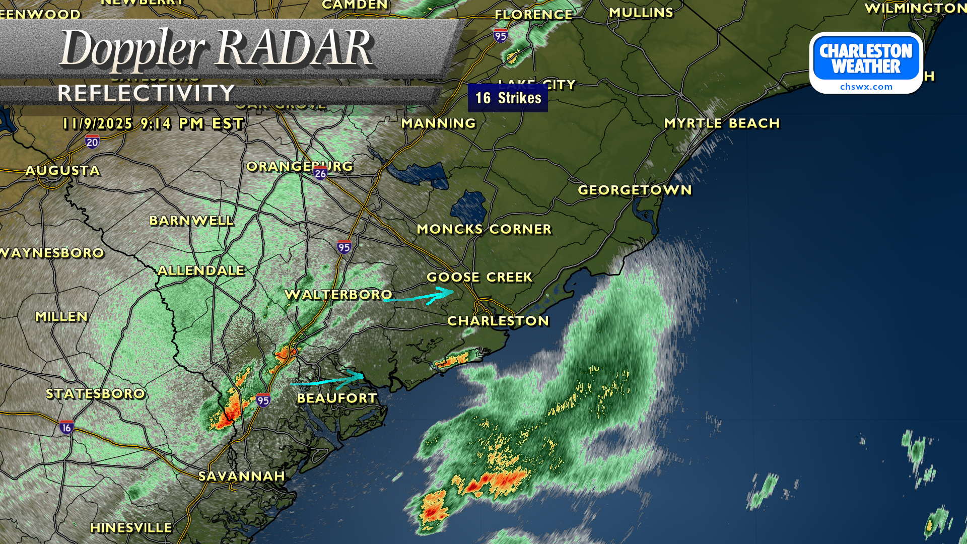 Showers and a few thunderstorms precede a strong cold front that will sweep through later tonight, ushering in an Arctic intrusion that brings about our first freeze Monday night/Tuesday morning.
