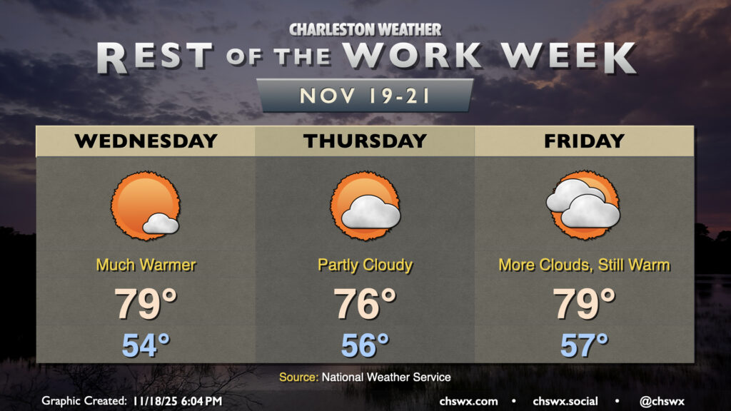 We may dodge a little fog Wednesday morning, but otherwise, expect the day to start on the mild side — generally mid-50s — before warming to near 80° in the afternoon under mostly sunny skies. Thursday could feature a little more in the way of clouds and perhaps a slight cooldown as a front approaches from the north and stalls out nearby. North of the front, temperatures should peak in the mid-70s, while south of it, temperatures could peak in the upper 70s to low 80s. Whatever cooldown takes place, if any, will be short-lived as the front buckles back northward on Friday, allowing temperatures to once again soar into the upper 70s to low 80s.