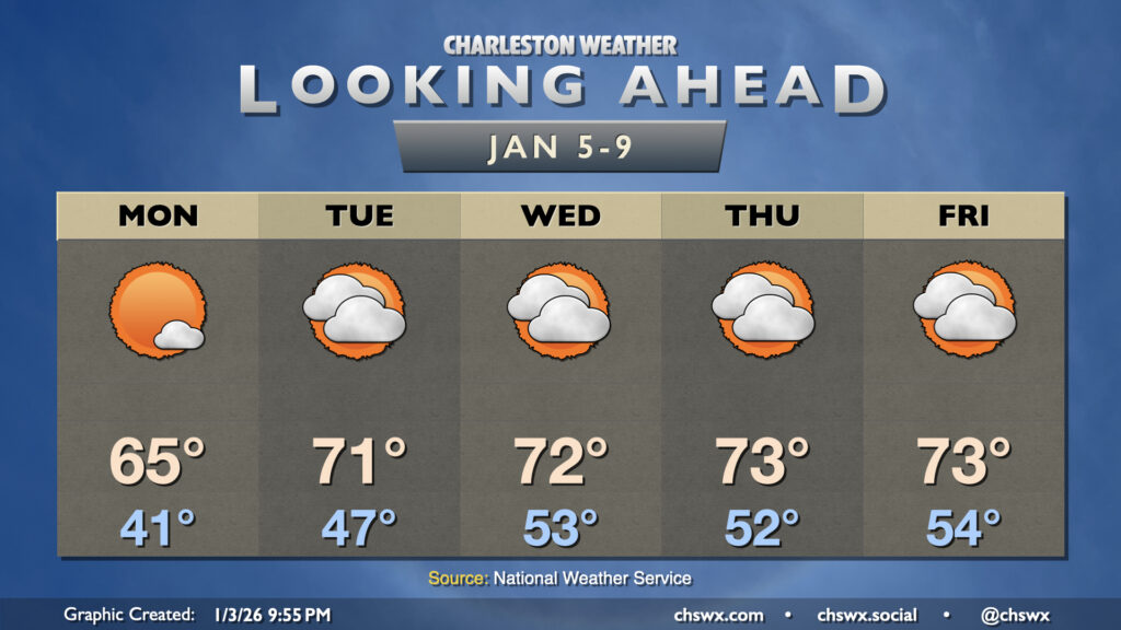 The first full work week of 2026 will certainly not feel January-like by any stretch as temperatures head well above normal courtesy of the aforementioned surface high over the Atlantic as well as high pressure trying to nudge in aloft from the south. The warming trend starts Monday as lows in the low 40s warm to the mid-60s in the afternoon, a few degrees warmer than we will run on Sunday. Another sharp jump in temperatures takes place Tuesday, though, as highs will soar into the low 70s, which is where we will sit each afternoon through the end of the week. Morning lows will be rather warm as well, with upper 40s Tuesday giving way to low-to-mid-50s each morning starting Wednesday.