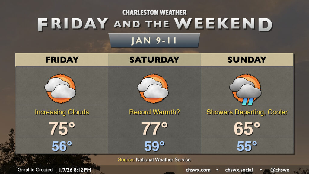 Record warmth is most likely on Saturday, especially with the morning low of 59° encroaching closely on the record warm low of 60° set in 1974. From there, strengthening southwesterly winds will pump plenty of warm air into the area, driving highs into the upper 70s and maybe even making a run for 80°. The record high for January 9 is 79°, set in 2008. Skies will continue to run partly to mostly cloudy throughout the day, which will have impacts on just how warm we can get. There will be a risk for a few showers to start arriving from the west late in the evening on Saturday ahead of the cold front.