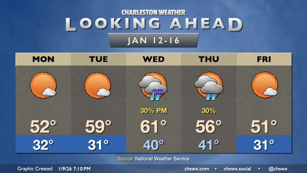 But first, we’ll likely get off to another foggy start across the area as lows fall to the upper 50s, once again butting right up against the dewpoint. (For contrast, the normal high for a mid-January day is 60°!) We’ll warm back into the mid-to-upper 70s once again, and the daily record high of 79° last set in 2008 may be threatened as a result. Much of the day will be rain-free, though we’ll be watching a line of weakening showers as it approaches the coast, which could bring some light rain to the area after sunset into early Sunday morning. However, any rain that falls won’t be remotely enough to dent the developing drought across the Lowcountry.