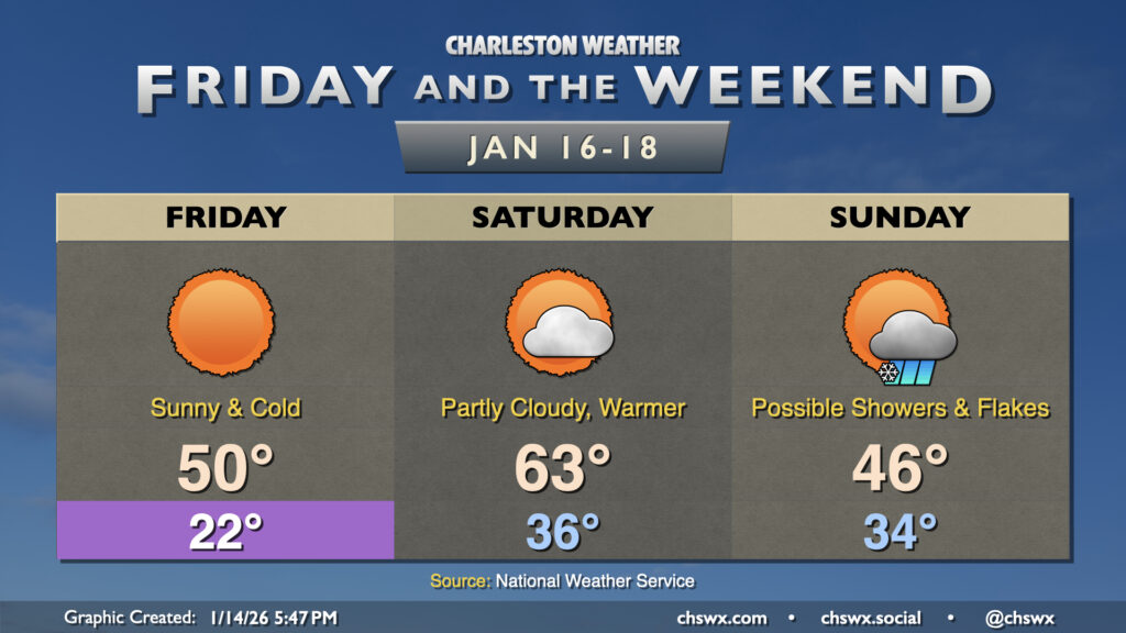Saturday will turn much warmer as winds go southwesterly ahead of a cold front. Temperatures start in the mid-30s, warming to the low to mid-60s in the afternoon with a few clouds from time to time. Then comes Sunday’s intrigue as the cold front moves by. It’s possible some moisture may be lingering behind it, and model guidance has been hinting a little more strongly at an upper low moving south enough to instigate some precipitation. The column of air above the surface will be quite cold, and could support some snowflakes mixed with rain in the Charleston metro area. Further to the west, the probability for more snow than rain ticks up a little bit. One variable to watch, too, could be the potential for low pressure to spin up offshore, which could assist in driving more precipitation — and cooler air into the area — to support more of that potentially being frozen precipitation.
