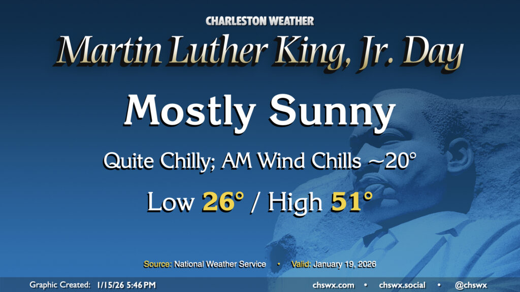 Temperatures on MLK Day fall to the mid-20s away from the locally warmer coastline as the cool and dry airmass sets in. The sunshine will help temperatures get a little above 50°, but don’t expect much more than that. However, there are no other weather concerns for your outdoor remembrances of Dr. King this year, just so long as you have a jacket and whatever else you need to stay warm.