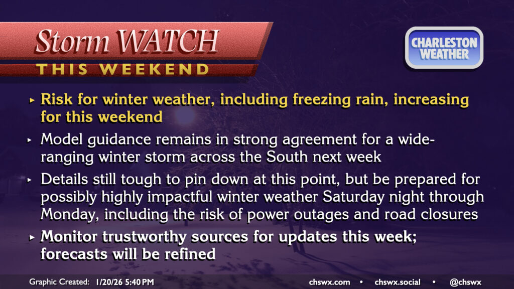 Data continues to pour in ahead of what looks to be a fairly widespread and impactful winter storm for much of the South into the Mid-Atlantic states for this weekend. Winter weather impacts are increasingly looking likely for our neck of the woods — especially for folks that are further north and inland — but the degree of those impacts and timing remain open questions with some continued disagreements in the model guidance as far as how far south subfreezing air can penetrate and how long precipitation lasts. For now, though, we should be getting ready for some travel disruptions as we head into the Saturday night through Monday morning timeframe, which is the most likely window for winter weather to occur. Unfortunately, the setup continues to favor freezing rain as the primary mode of winter weather, though some sleet may mix in as well. (We’ll be too far south for snow as warmer air aloft will continue to nose in for the duration of the event.) Continue to monitor forecast updates from trustworthy sources as we get closer to the weekend and can start to fine-tune more of the details on what we can expect.