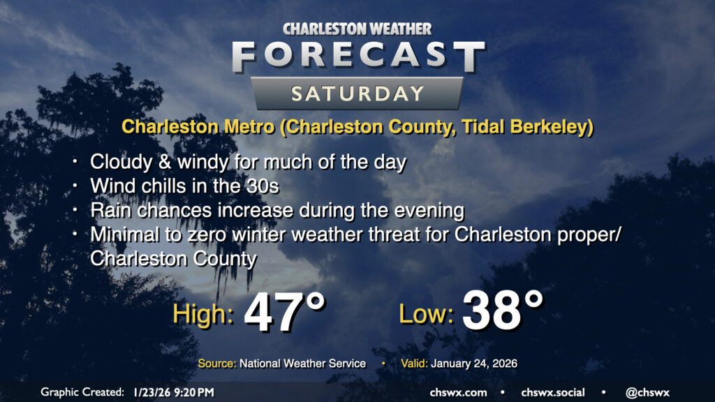 Cloud cover, gusty winds, and chilly temperatures will be the main story for much of the daytime hours on Saturday across the entire Lowcountry. In fact, we will likely get a bulk of the daylight hours in rain-free as the storm system takes its time to get here. High pressure will be wedging in from the north, though, and gusty northeasterly winds will be keeping temperatures pinned to the mid-40s at best during the day, with temperatures falling into the 30s shortly after sunset.