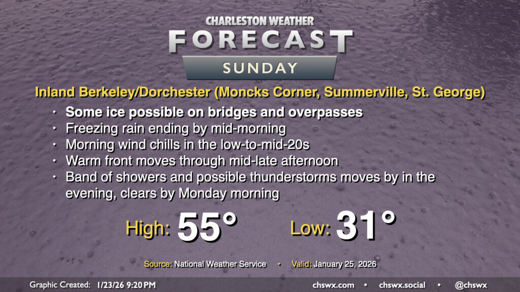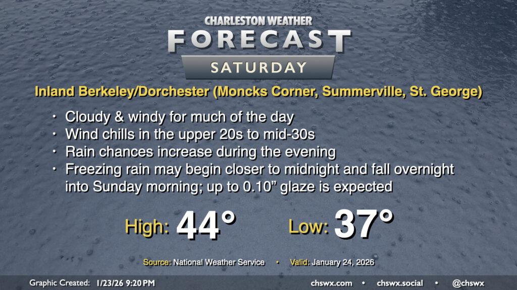The storm system will arrive in the Carolinas by evening, with the risk of rain arriving after sunset. The Winter Weather Advisory goes into effect at 7PM Saturday for inland Berkeley and Dorchester counties, marking the most likely time for any freezing rain accumulations. The overall expectation for freezing rain is a glaze up to a tenth of an inch on elevated surfaces, potentially including bridges and overpasses, across northern Berkeley and Dorchester.