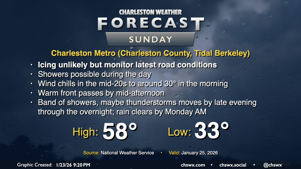 Icing issues aren’t really expected in the Charleston metro, especially along and east of Highway 17, but as mentioned earlier, we’ll be flirting with the freezing mark pretty closely Sunday morning, so some slick spots may not be completely out of the question. These should be short-lived, though, as temperatures head into the mid-to-upper 50s in the afternoon behind a warm front. Showers will be possible during the day, though as the warm front lifts north, we should get into a dry slot before a more substantial band of rain and maybe even a few thunderstorms moves by later Sunday night. This prefrontal band of rain will likely go down as the most substantial precipitation of the event for the Charleston metro, in fact. It’ll clear the area by daybreak Monday, followed by the aforementioned potent Arctic front.