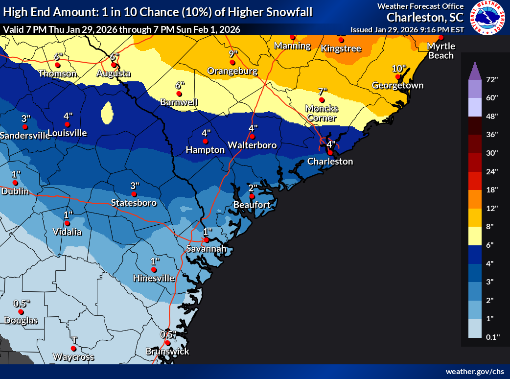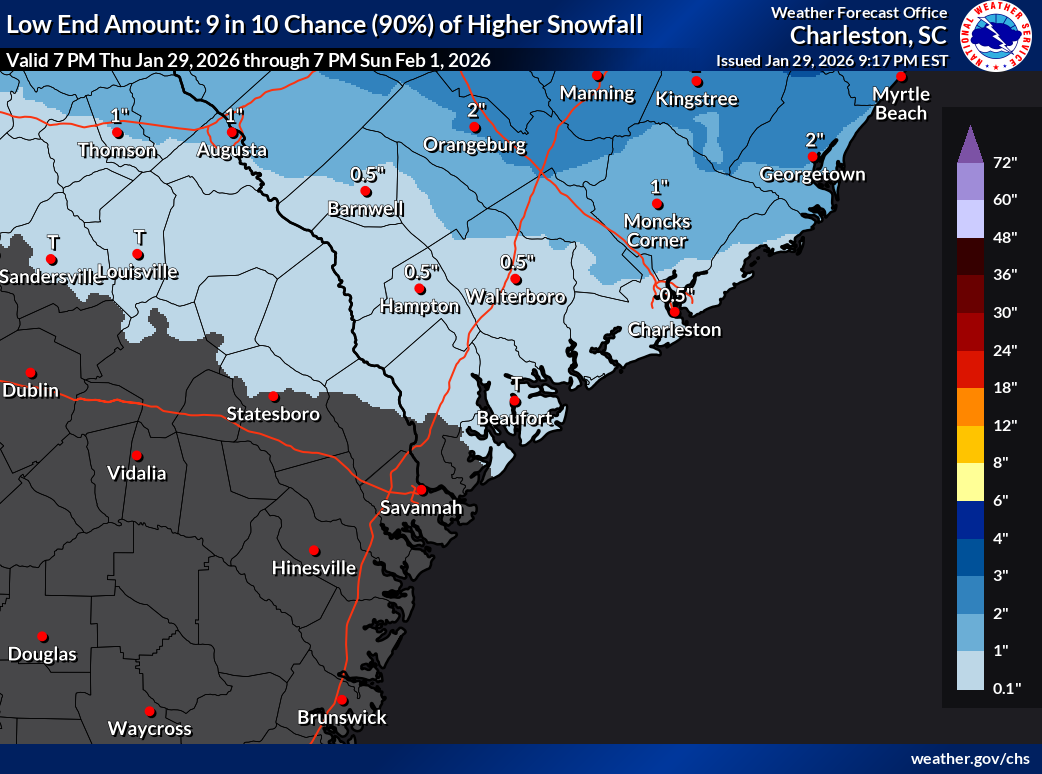 Generally speaking, the NWS forecast is looking for about 1-3″ for Charleston proper, with lower amounts as you get further southwest; those of you on Wadmalaw or Edisto may see a lot less. But yes, we should see snow to the coast. Further north and east, we’ll find the higher snow totals courtesy of closer proximity to the low pressure system; anywhere from 2-6″ of snow will be possible in northern Berkeley, Dorchester, and Charleston counties, with maybe even a bit more from Lake Moultrie to the Santee. The ranges are still a bit wide because there are still a lot of unknowns and small-scale perturbations that could make a big difference in totals. If and where bands of snow set up, for example, snow totals could be higher. And if you aren’t in one of those snow bands, you may end up seeing less snow than you would have if there was no banding at all.