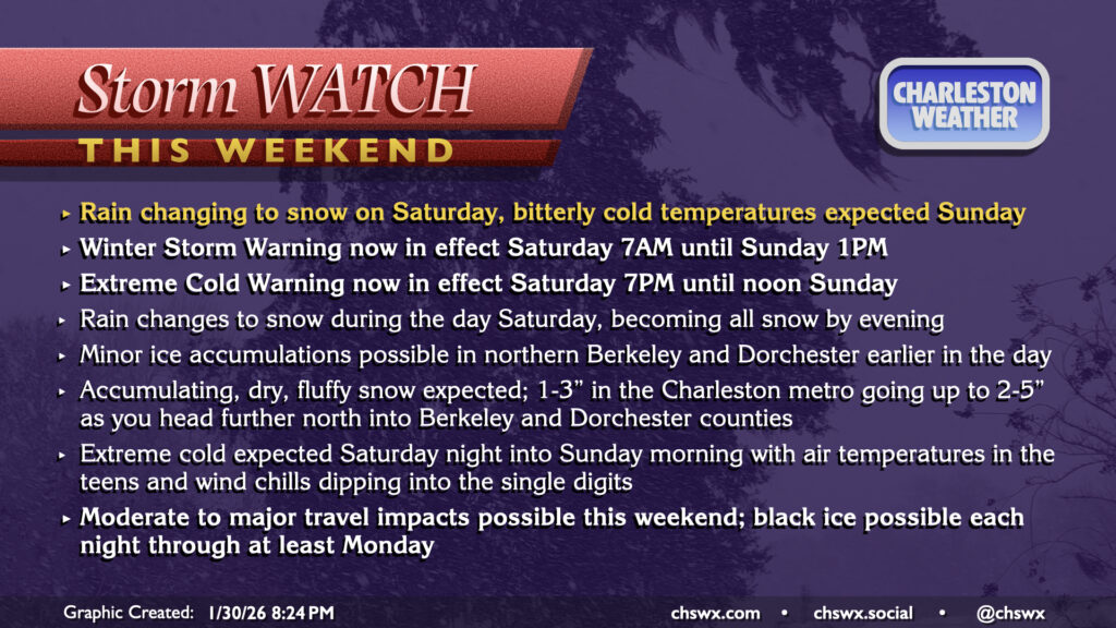 Well, it certainly appears as if the third time will be the charm for snow-lovers in the Lowcountry as a long-anticipated winter storm system impacts the area this weekend. A Winter Storm Warning goes into effect Saturday at 7AM and will run until Sunday at 1PM. Meanwhile, an Extreme Cold Warning will also go into effect Saturday at 7PM until noon Sunday for air temperatures in the mid-to-upper teens and wind chills dropping perhaps as low as 3° above zero in the morning — extraordinarily rare cold air for this part of the world.