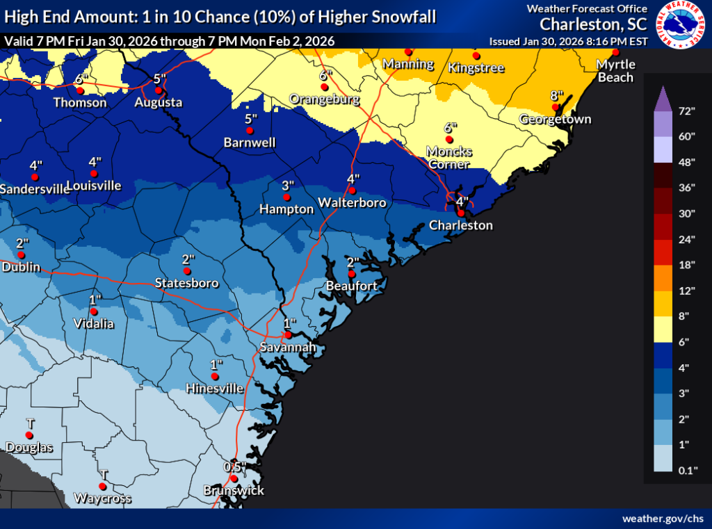 The bulk of the snow falls Saturday evening as the upper low traverses the area and the surface coastal low makes its closest pass. It’ll also be during this time when winds will kick up some, especially at the coast; gusts to 30 MPH aren’t out of the question there with gales expected in the coastal waters and Charleston Harbor. Given the snow’s dry and fluffy character, it’ll be more prone to being blown around with even some drifts forming. All in all, this should make for treacherous travel Saturday afternoon and evening, and your best bet is to stay hunkered in unless you absolutely must travel. Keep roads free for medical workers and other essential personnel, and don’t be the reason a first responder has to put themselves in harm’s way. Bridge closures and other matters, if necessary, will be announced by local authorities; the meteorological community has no real control over if and when those closures occur. Even if bridges and overpasses are open, they’ll be the first to freeze over, so use extra caution if traveling over them. Same for the airport; if you have a flight coming or going over the weekend, check with your airline on that flight’s status and be as flexible as you can with your travel plans.