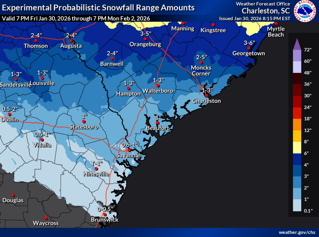 As we would expect, the snowfall ranges have dialed in a little bit better on the extremes over the last day as more model data comes in. Generally speaking, the most likely outcome for snowfall will be 1-3″ over the Charleston metro area and points southward, approaching 2-5″ as you head further north into places like Moncks Corner and Summerville. Further toward the Santee and the I-26/95 interchange, we start to get into the 3-6″ range. Locally higher (and lower) amounts remain possible especially around where snow bands, if any, set up. Dry slots and other factors can still play havoc as the event plays out, so there is still the potential for a little less snow than the ranges depicted above.