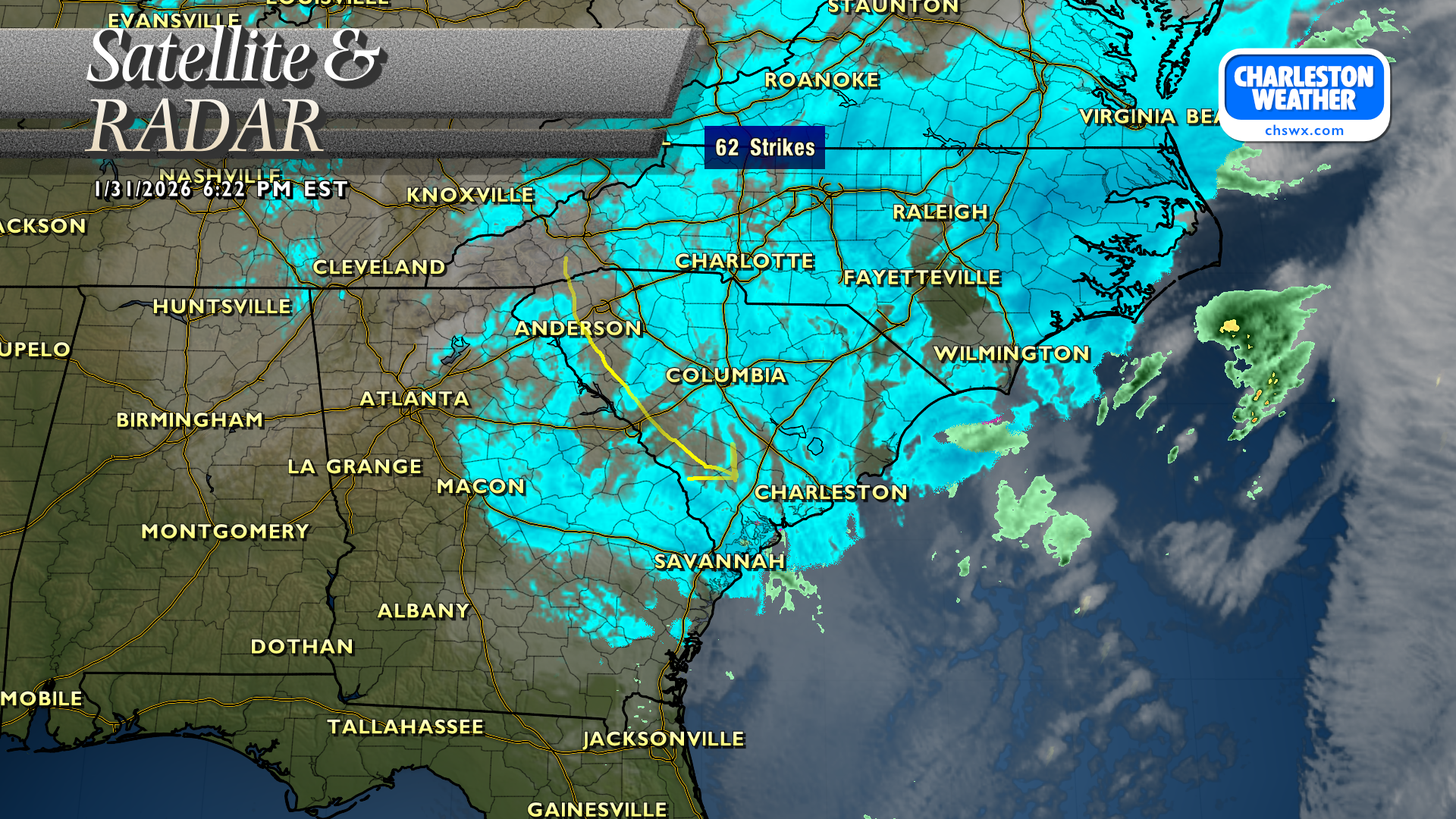 The dry slot coming down the Savannah River is one reason why it appears areas northeast of 26 are going to get their best bang for their snow buck; may see rates taper down into parts of the Tri-County soon as this rotates in.