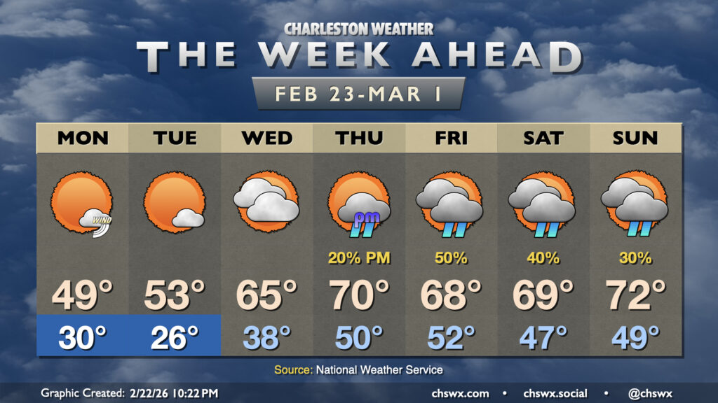 Winter makes a brief return to the Lowcountry to start the final week of February, but temperatures look to rebound for the second half of the week, albeit with some shower chances.