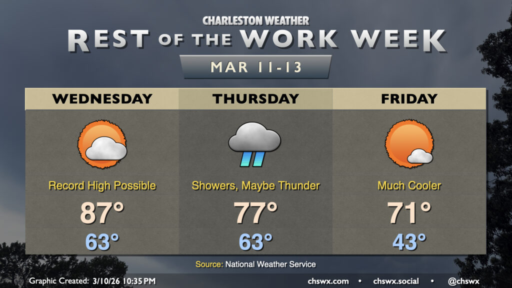 Another very warm day is on tap for Wednesday on the heels of the warmest day thus far in 2026. Wednesday’s forecast high of 87°, if it verifies, would break the daily record high for March 11 of 85° set in 2015. We’ll have plenty of sunshine for a good bit of the day, though cloud cover will tick up in the evening ahead of a cold front that will begin to restore a little order to a spring preview that’s gotten a bit out of hand.