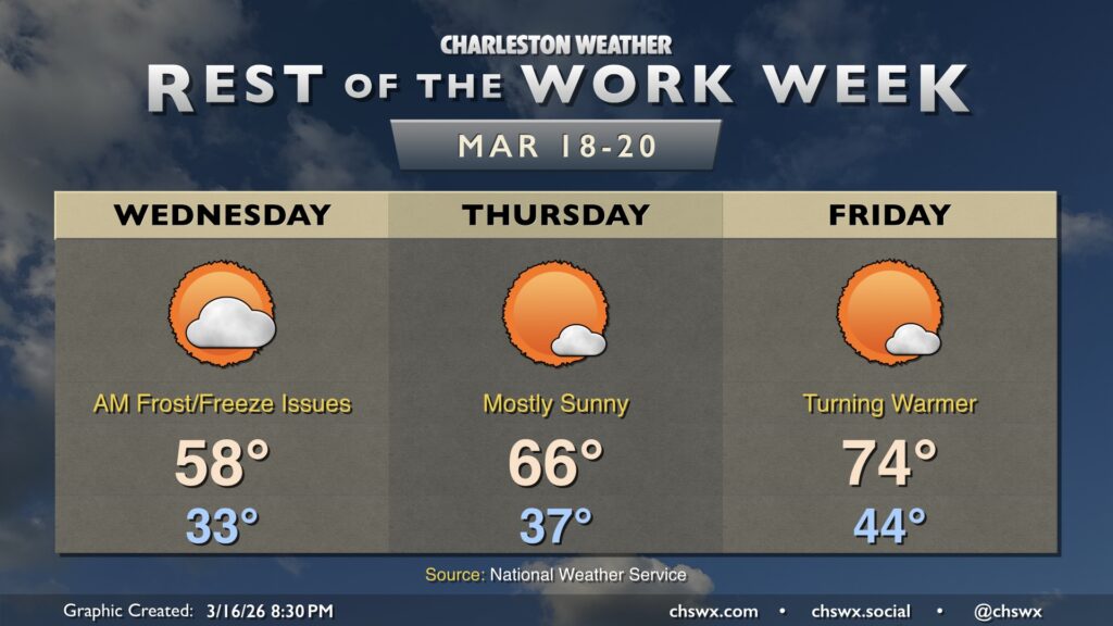 The only weather concern for the rest of the work week will be the risk for frost and freeze issues Tuesday night into Wednesday morning. Lows will fall below freezing away from the coast, and with calmer winds compared to Monday night, frost should develop pretty much everywhere else. You’ll want to protect sensitive vegetation for sure Tuesday night through Wednesday morning as a result.