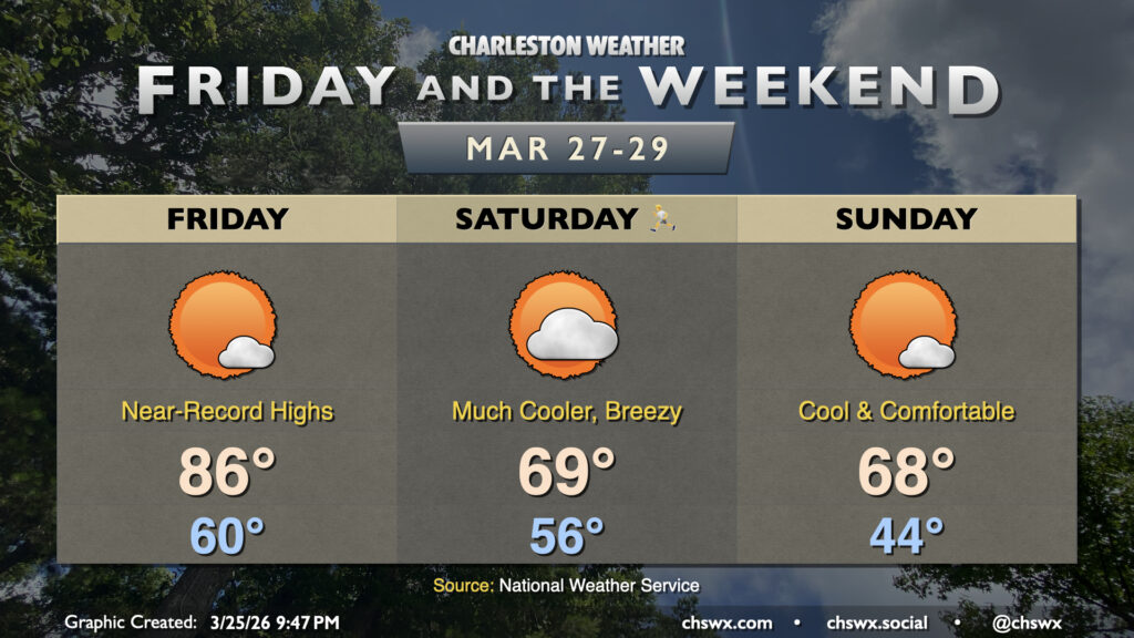 Our brief cooldown comes to an end to close out the work week, with sunshine and 80s returning to the Lowcountry on Thursday. The day starts in the low-to-mid-50s, so you might go for a light jacket to start, but you’ll be able to shed that by mid-morning as temperatures climb. Highs peaking around 80° run a few degrees above normal for late March. Winds are quiet to start the day but pick up a little as the seabreeze pushes inland later in the day.