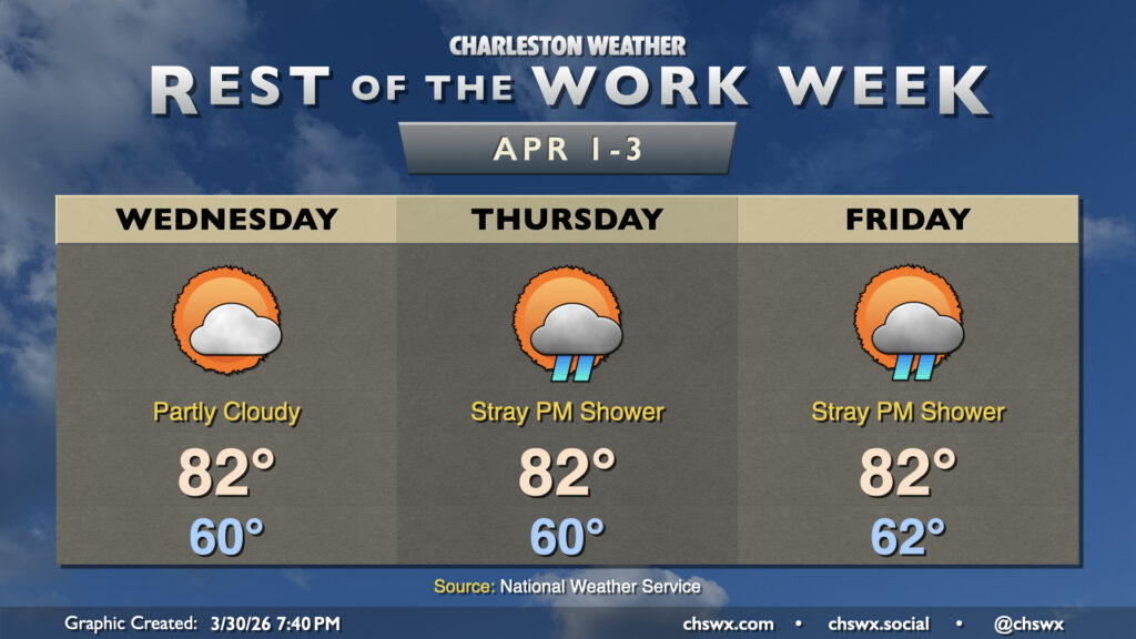 After a couple cooler days, the 80s return to the Lowcountry starting Tuesday and lasting well into the beginning of April. High pressure remains the main weather feature, keeping us generally on the quiet side. A southerly breeze around 5-10 MPH will be common, especially as we get into the afternoon. Thankfully, some higher dewpoints will also continue to put a dent in the fire danger.