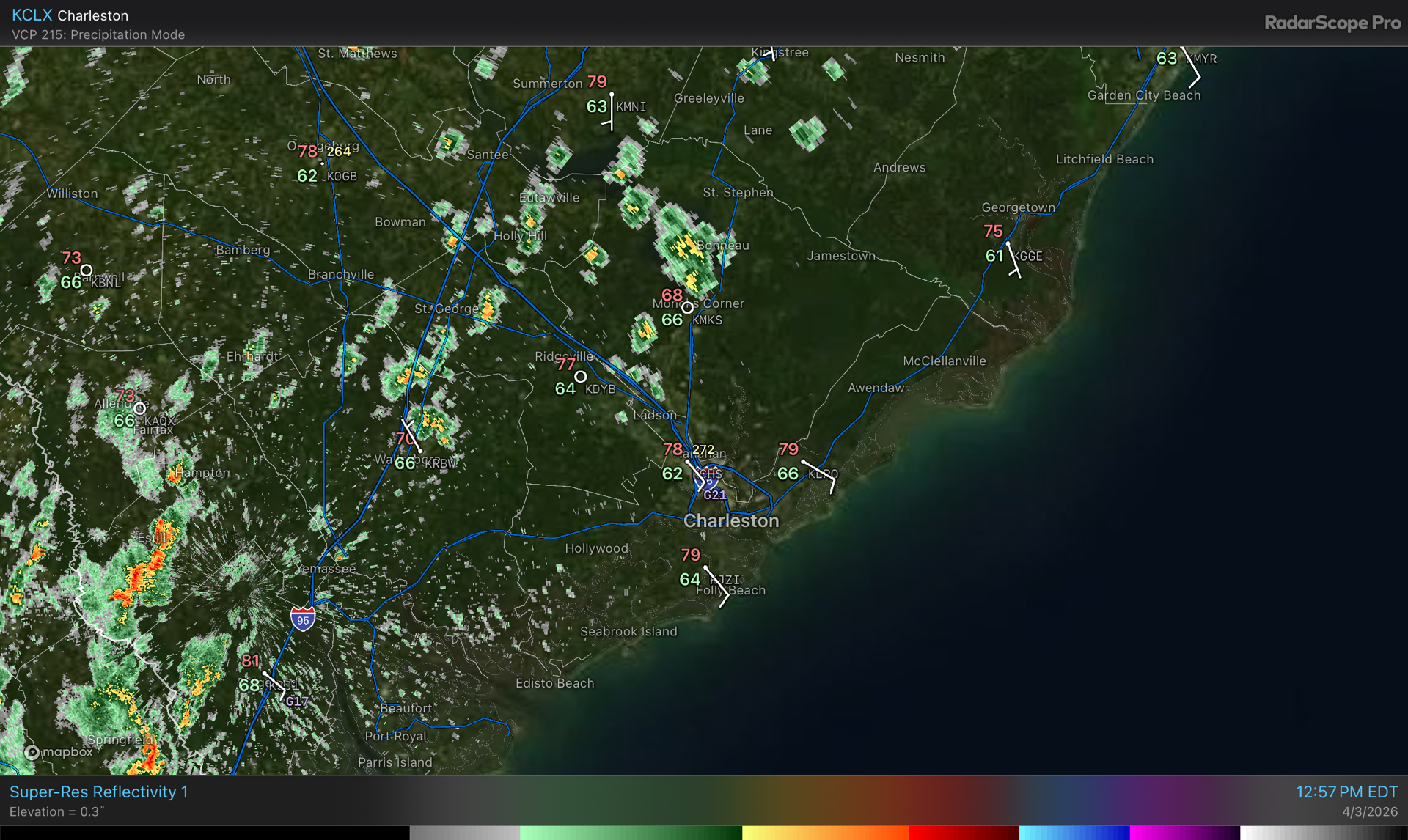 Showers are drifting northward generally along and inland of 17-A while many of us remain rain-free. Pushing 80° in much of the metro, while Moncks Corner is down to a rain-cooled 68°.