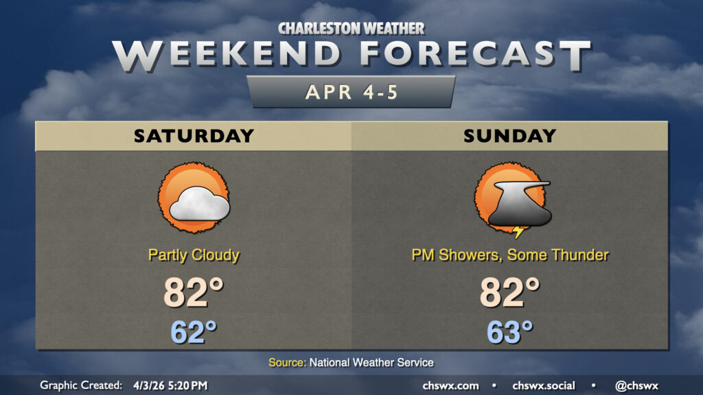 High pressure remains the dominant weather features at the surface and aloft one more day on Saturday. We’ll stay warmer than normal for early April as lows in the low 60s warm to the low 80s in the afternoon under partly cloudy to mostly sunny skies. There’s a risk for a stray shower further inland, but unlike Friday’s scattering of showers, coverage should be much more limited.
