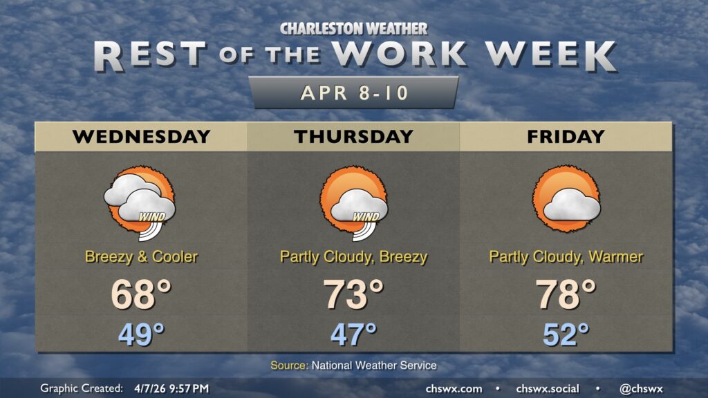 We will start to see temperatures warm as we get into the latter part of the work week. Temperatures Thursday head into the low 70s, and the upper 70s return for Friday as the cool high pressure wedge from Wednesday erodes. Breezy conditions continue Thursday, and there may even be a stray shower near the coast as a coastal trough takes shape. By Friday, though, we’ll see much more sunshine. That’ll continue into the weekend, too, with temperatures heading back into the low 80s.