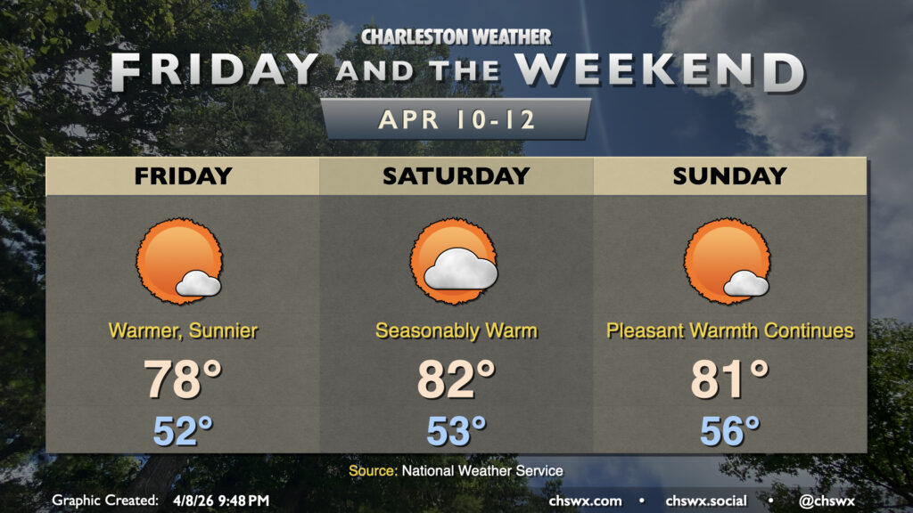 The warming trend gets more pronounced starting Friday as high pressure slips offshore and builds in from the Atlantic, while high pressure aloft nudges in from the west. The stacking high pressure and southerly flow at the surface will bring temperatures into the upper 70s on Friday and the low 80s each day this weekend. These temperatures continue to run above normal for this point in April — we’d normally see temperatures like this toward the end of the month into May. No rain is expected, which isn’t the best news for the ongoing drought, but will be acceptable for getting out and about.