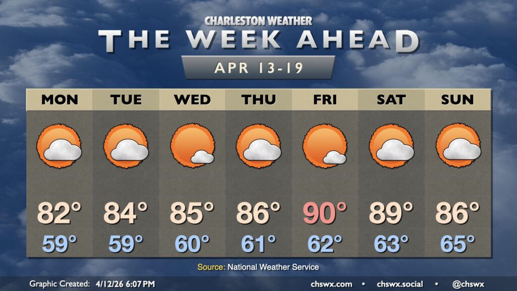 Increasingly warm and dry weather will be the main story this week as stacked high pressure remains the primary weather driver across the Southeast, including the Lowcountry. Keep the sprinkler systems cued up this week as there’s no rain in sight for at least the next seven days with not a lot of moisture and plenty of sinking air to inhibit shower and thunderstorm development. By the end of the week, we could be approaching the 90s once again, with record highs a possibility.
