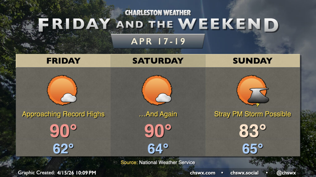Winds a few thousand feet up turn more southwesterly for Saturday as a cold front approaches, and with ridging continuing to nudge in from the south, we can expect another very warm — approaching record warm — day in the Lowcountry. We start the day in the mid-60s, warming to around 90° in the afternoon. This will be in striking distance of the daily high temperature record for April 18, which is 92° also set in 1967. Once again, mostly sunny skies are anticipated, with a dearth of moisture and sinking air aloft keeping a lid on any showers or thunderstorms.