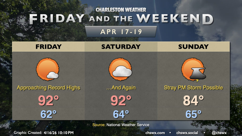High pressure remains in control for Saturday, and even asserts itself a bit more for one more day. As a result, we can expect high temperatures to once again approach record levels Saturday afternoon primarily at the airport; a bit more southerly component to the wind will keep temperatures a bit cooler downtown. Expect highs in the low 90s inland with mid-80s downtown, and even cooler at the beaches. There may be a bit of an uptick in cloud cover especially as a front begins to approach the area later in the day.