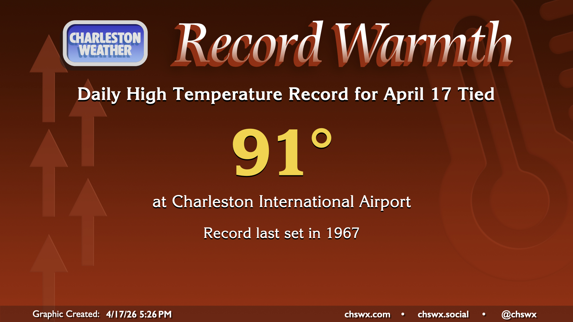 The high temperature at the airport reached 91° today, tying the daily high temperature record set in 1967. Downtown topped out at 85°, missing the record high there by one degree.