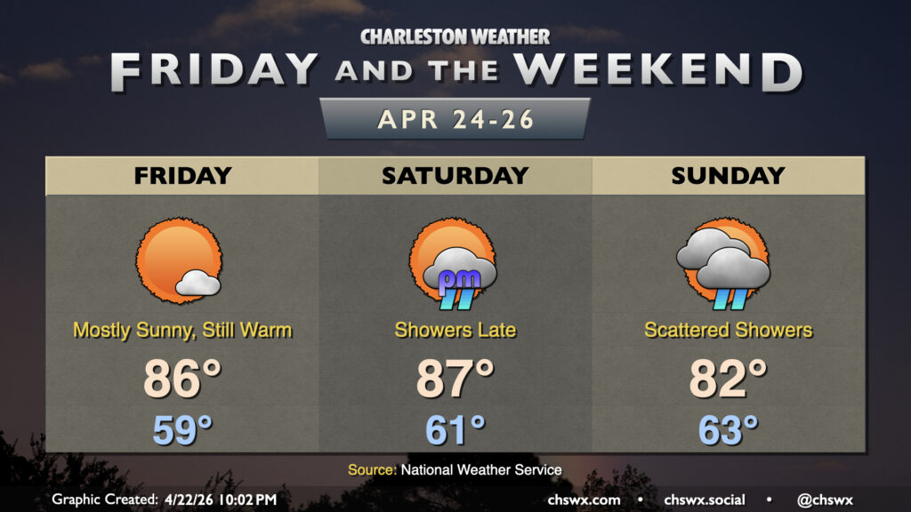 High pressure will remain in control on Thursday, keeping mostly sunny skies in place. It won’t be all sunshine, though, as smoke from nearby wildfires in Georgia drifts into the area, which could have negative impacts on air quality. An Air Quality Alert is in effect for the Lowcountry through Thursday evening as a result; people who have sensitivities to poor air quality should limit time outdoors. Temperatures will take another step up as southwesterly winds help pump in warmer air; expect lows in the mid-50s to warm to the mid-to-upper 80s in the afternoon.